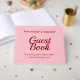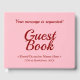 This simple event guestbook features the messages "Guest Book" and "Your message is requested!", along with a personalized date event/occasion name. The text is coloured dark red, and the background is coloured pink. A generic, customizable guest book like this could perhaps be used at an event such as a family reunion, a birthday party, a wedding anniversary celebration, a wedding, or some other event with guests who may want to leave a message.