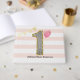 Beautiful pink and gold 1st birthday guest book for her. The background is a soft pink and white striped design. The front cover features the number one in a black and white stripe with a gold glitter trim. Please note there is not actual glitter on this 1st birthday guestbook, but a design effect. Please see photos. You will be able to easily personalize with her name on the front. A beautiful birthday keepsake for her.