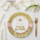 Pink and gold baby shower plates have a glittery gold background with gold and pink stars on the top. They say "Ready to POP"