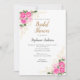 This elegant floral design is perfect for trendy bridal shower invitations. The text is framed with bouquets of purple watercolor roses and gold floral accents in two opposite corners.