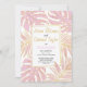 Tropical monstera and palm leaves pink and gold engagement party invitation. It showcases a pattern of tropical leaves with gold outline on and your text in a white frame. The back includes a gold polka dot pattern.