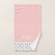 This custom made-to-order bath towel set has a chic modern trellis pattern in blush pink, light grey and white. Personalize it with a classic 3 letter monogram or other custom text. Use the design tools to choose any background colours, edit the text fonts and colours or upload your own photos to create a unique custom set of bath towels to match any bathroom decor. The set includes a coordinating bath towel, hand towel and wash cloth or select individual towel sizes as needed.