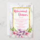 A retirement dinner invitation with an elegant design - a faux marble texture in white makes up the background. Layered over top is a frame with a faux gold foil border. Large pink and purple watercolor magnolia flowers with green leafy accents decorate the design.