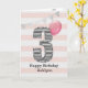 A pink and silver 3rd birthday girl card, which you can personalize with her name. The front of this beautiful 3rd birthday card for her features the number three in a black and white stripe with an outline of glitter with a pink balloon ready to float way. Please note the silver glitter is a design effect and no actual glitter will be on this birthday card. The background is a soft white and pink with a soft silver bunting banner at the top.The inside message can be easily personalized if you wanted. A pretty 3rd birthday card keepsake for her.