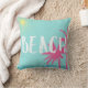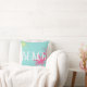Light teal throw pillow with pink palm tree and "beach" written in white.