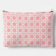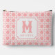 This stylish monogram zipper pouch design features a modern pink and white woven rattan cane pattern on the front and back. The front side has a notched pink frame with an initial in white.