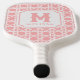 This stylish monogram pickleball paddle design features a modern pink and white woven rattan cane pattern on the front and back. The front side has a notched pink frame with an initial in white.