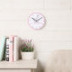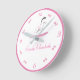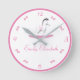 Pink and White Rocking Horse design features the adorable image of a pink and white rocking horse as main design. Child's name is displayed below the image. The numbers 12, 3, 6 and 9 are shown in bright pink lettering. All other numbers are represented by pretty, pink bows. Designed to accompany the Pink and White Rocking Horse theme Baby Shower invitations and nursery accessories.