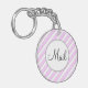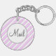 A keychain for your mailbox with script letters on a pink striped pattern with thin grey stripes on white.