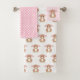 Fun bath towel set, with the bath towel done in white with cute little bunnies all over. The hand towel is done in a pink and white polka dots and the wash cloth is a white and pink quatrefoil pattern, with one large cute rabbit. Sweet towel set for any young girl's bathroom.