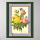 Antique reproduction of pink and yellow rose flowers botanical artwork by famous artist Pierre Redoute with blue butterflies. The flowers are listed on the artwork; Persian yellow roses (rosa Lutea) and pink tea roses (rosa indica). Framed with elements from antique manuscripts.