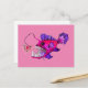 colourful artwork of a pink and purple coloured anglerfish with big teeth swimming around on a pink coloured postcard.