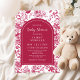 This beautiful and elegant baby shower invitation features an antique pink Chinoiserie pattern. The text combines handwritten script and serif fonts for a stylish and modern look. This is perfect for a spring or summer garden baby shower.
