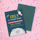 Invite friends and family to an out of this world Space Birthday with this birthday invitation featuring a girl astronaut with a tan skin tone in space surrounded by the moon, stars and a rocket. This invitation has a patterned back side.