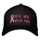 Fits well due to elastic edging, not adjustable. Good qualty material. Good quality embroidering. Subtle lettering (white on beige) just as my wife likes.