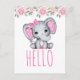 A hello postcard with a cute pink elephant watercolor illustration. She has cute pink and white polka dot ears and a pretty pink ribbon bow on top of her head. The top is decorated with a beautiful rose bouquet.