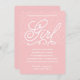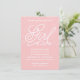 This sweet baby shower invite features pretty script calligraphy, floral elements, and a pink background.