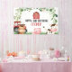 Sweet red farm themed birthday party banner featuring a red barn and tractor as well as a donkey, pig, cow and lovely mostly eucalyptus foliage arrangement. Birthday party invitation and decor is also available at the store