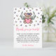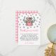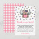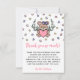 Baby girl bear themed baby shower thank you card with a hand drawn illustration of a teddy bear and greenery surrounded by little stars. Purple and pink baby girl baby shower thank you flat card with a teddy bear theme. Teddy bear baby girl shower thank you card in pink stars and a bear wearing a purple bow. Pink we can bearly wait themed baby shower thank you card with a printed thank you note.