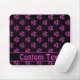 Black mousepad with a repeating biohazard symbol pattern in bright pink and editable text field, personalize with up to 15 letters, numerals or symbols.