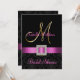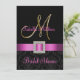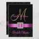Sophisticated elegance is conveyed by this beautiful Bridal Shower Card design. A black on black damask pattern serves as a background for a photo effect of the Metallic Gold Initial M and a Fuchsia Pink satin ribbon and diamond brooch ALL PRINTED on FLAT CARD Bridal Shower Invitation. Contemporary, yet classic damask pattern with a design which allows you to personalize the front with the bride's name and the back is free to add your customized bridal shower invitation text. Invitation is set for monogram initial "M". For other letters, different ribbon colour and background please contact designer at luxuryweddinginvitations@gmail.com. Layout Design by Elke Clarke©. Graphics licensed. Also, choose from a variety of fonts and beautiful papers to make your invitations PERFECT!
