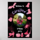 Pink and black Birthday party welcome poster with illustrated Halloween motifs. In the centre you can customize the poster with your baby's favourite and you can modify all the text that comes out. On the back a print with funny ghosts flying.