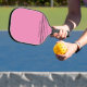 This modern pickleball paddle design with a bright pink background and thin sans serif font personalized name and sporty thin retro stripe pattern near the base on the racket handle in black, a simple and professional pickleball racket.