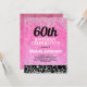 Fun 60th birthday party invitation for women in bright, hot pink on black with sparkly silver glitter. You can customize the text on this card for a birthday party for any age you are celebrating.