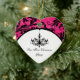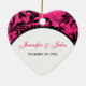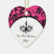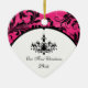 This custom, personalized modern and trendy hot fuchsia pink, black and white ballroom chandelier "Our First Christmas" heart shaped ceramic wedding keepsake ornament has a background pattern of pink and black ornate scrolls on it that would make an ideal house-warming gift for the Newlyweds, a luxury wedding favour, or give it to family and friends who helped make your wedding extra special. The text is customizable. If you require any other matching items, please email your request to niteowlstudio@gmail.com.