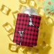 This can cooler has a mid-century modern design of solid black diamonds inside black diamond outlines with pink blobs under them, all on a field of white.