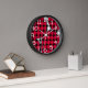 This wall clock has a mid-century modern design of solid black diamonds inside black diamond outlines with pink blobs under them, all on a field of white.