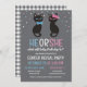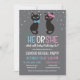 Perfect gender reveal invitation for October without being too Halloween with two black cats, one wearing a blue bow tie and the other wearing a pink bow on her ear. Cat themed gender reveal invitation in pink and blue and grey with cute black cats adorned with bows. Send out these gender reveal invitations for your cat themed gender reveal party with a He or She wording.