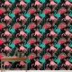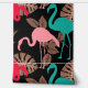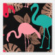 Colourful pattern with flamingos in pink and blue surrounded by tropical plants against black background.