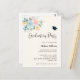 Graduation invitation with a pretty watercolor illustration. A flower bouquet with pink and blue flowers surrounded by green leaves and sprigs.
