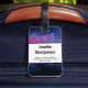 A luggage tag with a beautiful abstract design in pink and blue. White stars sprinkled throughout this image of the cosmos. Trippy and cool.