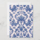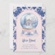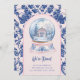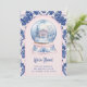 This Change of address party invitation has a preppy grandmillennial design featuring a Gingerbread House in a snow globe with a blue and blush pink arched border around the edge. The front and back have a coordinating damask pattern.