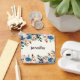 A key chain with a border of pretty painted pink and blue roses and green leaves. Set on a light yellow background.