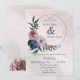 Beautiful botanical wedding invitation featuring pink, white and navy blue flowers with green leaves on a green circle forming a pretty romantic wreath.