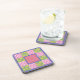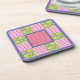 A set of square, cork-backed Coasters or Drink Mats, with a pretty faux-patchwork pattern of deep pink, violet blue and yellow primroses on a leafy green background, with deep pink and white check gingham and polka dots; from the Posh & Painterly "Primroses" collection.