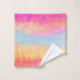Towel set with an image of a painted abstract design. Yellow blue and pink stripes. Bold and vibrant background pattern.