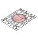 A stylish white and shimmery pink blush harlequin diamond pattern as a backdrop with a pink sphere in the middle with grey jewels for personalizing to make it uniquely your own. Elegant chic vibes.