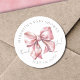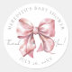 A cute and girly pink bow baby shower sticker featuring an adorable baby pink watercolor bow. At the top, it has the mother's name and "Baby Shower," and at the bottom, the date. In the centre, next to the pink bow, is "Thank You!" in script. This simple and minimal classic baby shower design has grey text in a mix of serif font and script typography, creating a sophisticated yet cute and elegant coquette look. You can change the font colours and the background colour to your preference. Personalized Elegant Watercolor Pink Bow Baby Shower Theme Thank You Sticker Label