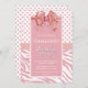 A pink and white birthday invitation featuring a festive bow, polka dots, and zebra stripes while the text is framed with a faux glitter border.