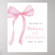 Welcome your birthday guests with an adorable personalized welcome sign. Frame the sign and display it on a table near the entrance or mount the poster on foam and display it outside on an easel. The design features a hand painted pink watercolor bow.