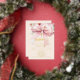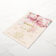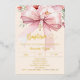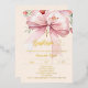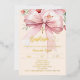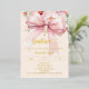 A soft cream, peach coloured background, decorated with a pink large bow and, a golden cross and pink flowers. Personalize and add a name and details details. Real gold foil text.