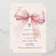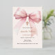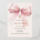 A soft beige, cream coloured background, decorated with a pink large bow and a cross. Personalize and add a name and details details.