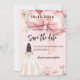An elegant blush pink background, decorated with a large pink bow, pink flowers and a girl in a cream coloured dress. Personalize and add a name and details.