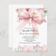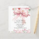 A white background, decorated with a pink large bow and, a golden cross and pink flowers. Personalize and add a name and details details.