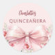 A soft blush pink coloured background. Decorated with a large pink bow and pink flowers. Personalize and add a name. Black handwritten style script.