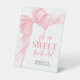Girls Are Sweet Please Take A Treat Tabletop Sign. This adorable sign features a playful watercolor bow with a ribbon frame accenting the top and left side, adding a sweet and stylish touch to your setup. The phrase “Girls Are Sweet Please Take A Treat” is displayed prominently in a mix of fun handwritten script and classic serif fonts, creating a charming and playful look.